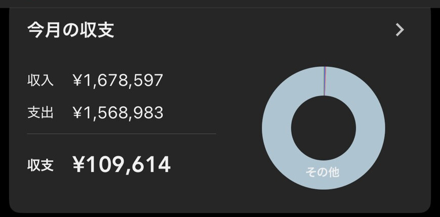 こちらが私の家計簿アプリのzaimの1カ月の収支画像です。この収支という部分しかお金はありません。この約11万円だけを銀行口座間で振込を繰り返してポイントを貯めてます。