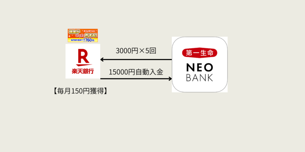 - ①3,000円×5回の被振り込みで毎月150円回収