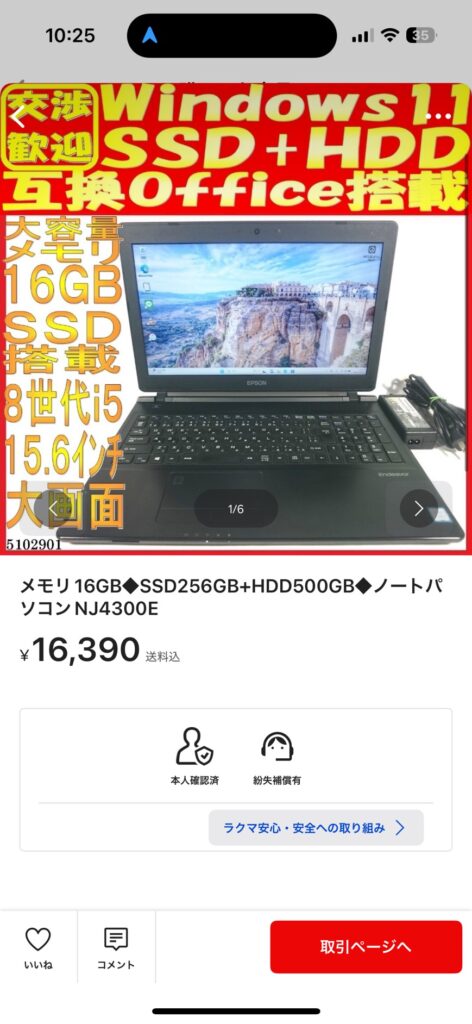 そうやって探しているうちに、楽天ラクマで16,390円の中古PCを発見しました。